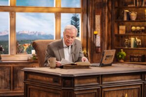 Through the Bible is being produced by Betsy Massoth and filmed in Studio C in the IPG (internal parking garage) at Charis. It’s filmed in a beautiful new set that was built in only a week and a half. Although the format of Andrew being 1-on-1 with the camera lends itself to The Gospel Truth daily show, this new show has a look-and-feel that is a little classier, with Andrew wearing a suit jacket and the set having warm tones, plants and decorative objects on the bookshelves, lots of wood elements including a gorgeous new desk, and a lovely Colorado LED background out of the windows. As Elizabeth Muren shares, it is elegant, homey, and fits his personality.