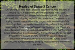 They have seen God move in extraordinary ways at Charis DFW. See below to read three amazing testimonies! But these are just a few of the many testimonies they have witnessed—others include financial breakthroughs, miraculous tuition provision, family restoration, and personal transformation. Kelley shares, “God is so faithful, and we are honored to see Him move so powerfully through the lives of our students.”