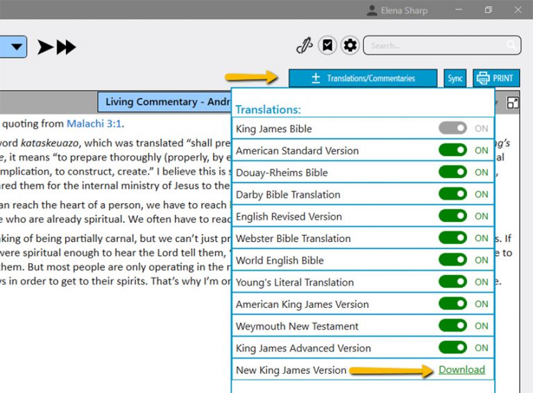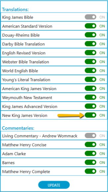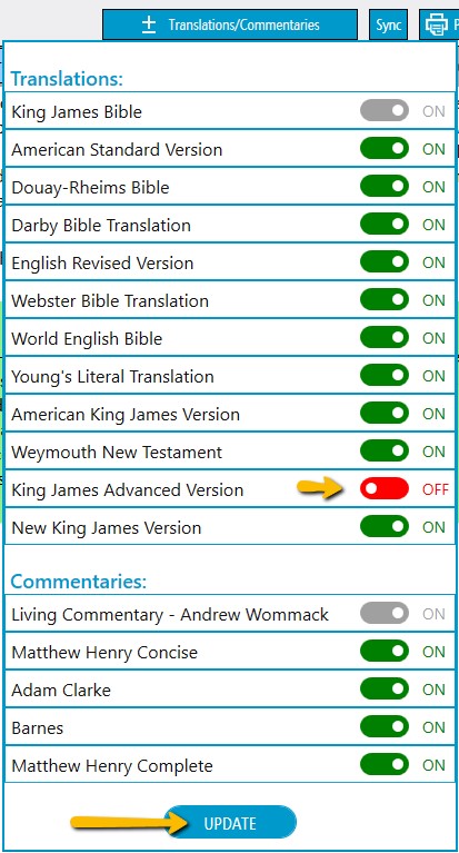 Note: The King James Bible and the Living Commentary are always set in the “On” position and cannot be changed.